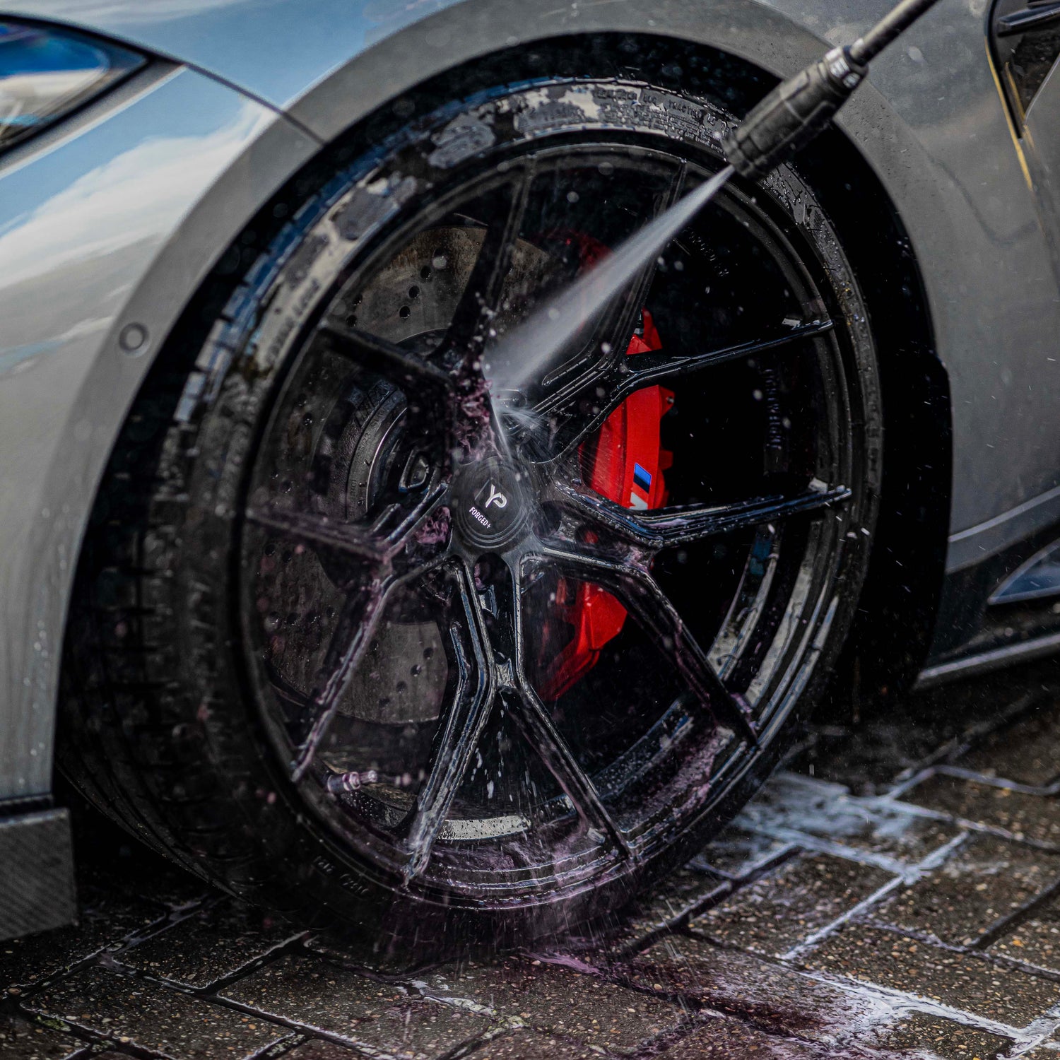 In the washing workflow, we recommend cleaning the rims before the actual vehicle wash: Spray Q²M Iron WheelCleaner, let it work, and rinse off – only then wash the bodywork. This way, no wheel cleaner splashes get onto the freshly washed paintwork. For heavily soiled rims: first pre-rinse roughly with high pressure, then spray on WheelCleaner, after the dwell time work with a wheel brush and rinse again with high pressure. The complete cleaning sequence: WheelCleaner → Rinse → Wheel brush for detailed areas → Rinse → Dry → Seal with Q² Rim EVO.