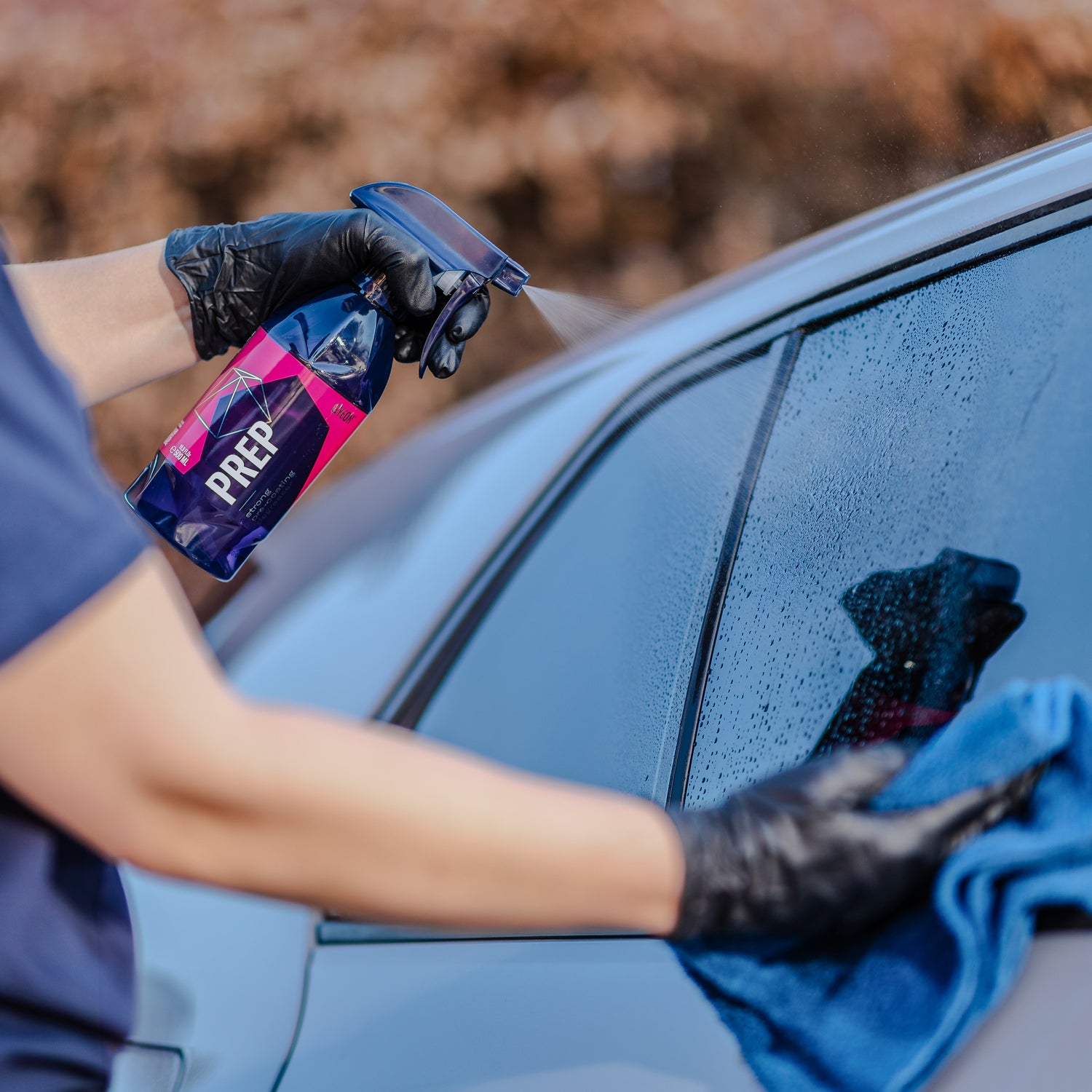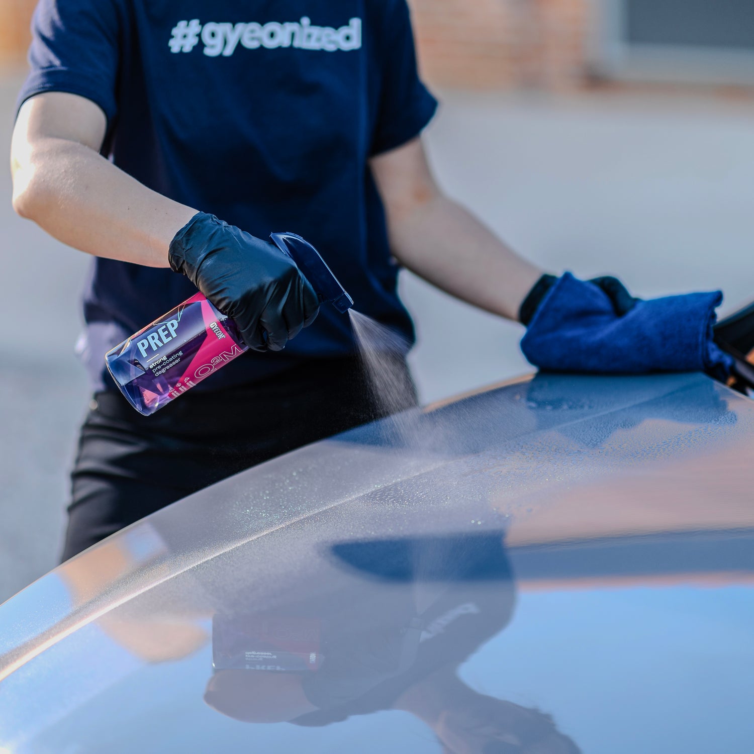 Application of GYEON Q²M Prep with microfiber cloth on dark polished paint