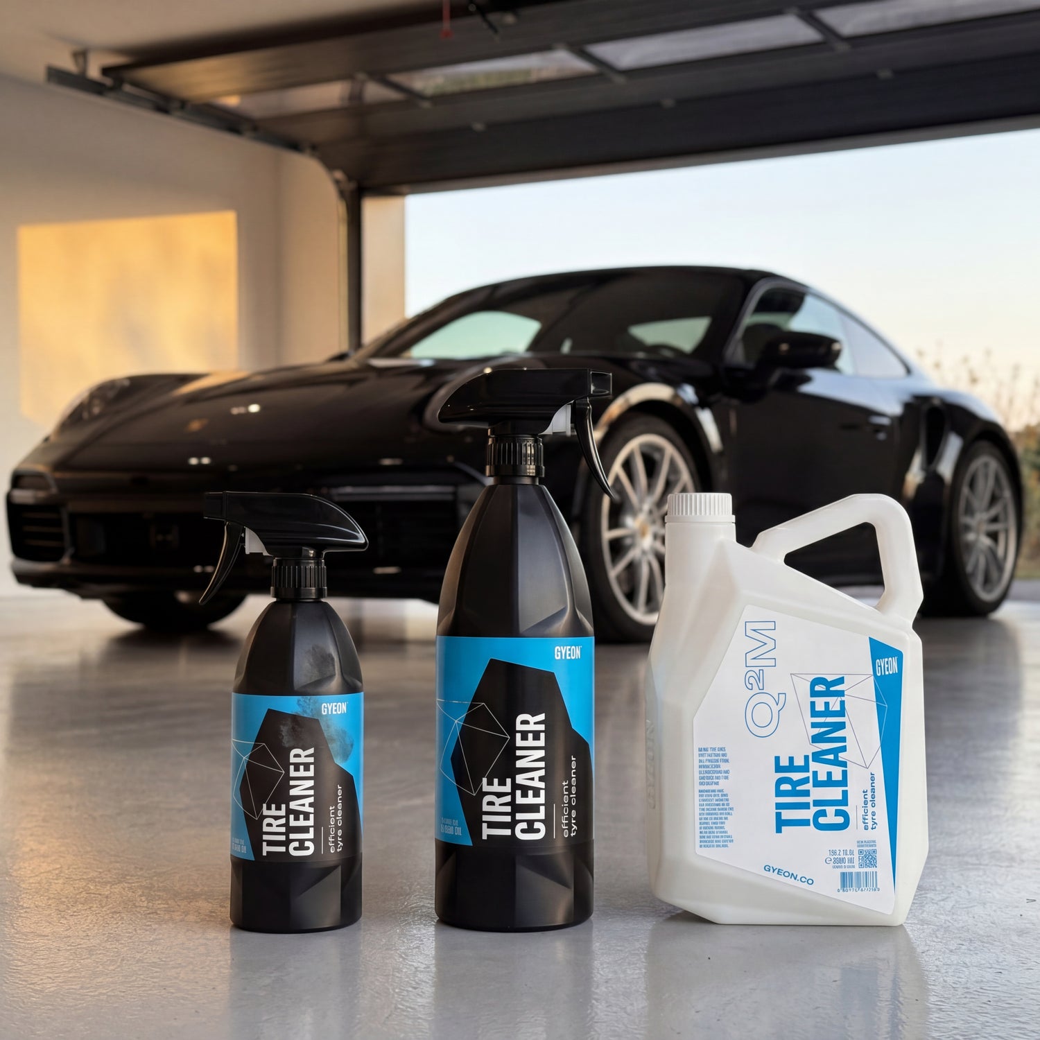 What is GYEON Q²M TireCleaner? An alkaline tire cleaner that removes old dressings, road grime, and "bleeding" antiozonants from the rubber sidewall, preparing the tire for new care or a tire coating. Not suitable for alloy wheels, painted surfaces, or for pure blackening without subsequent dressing.