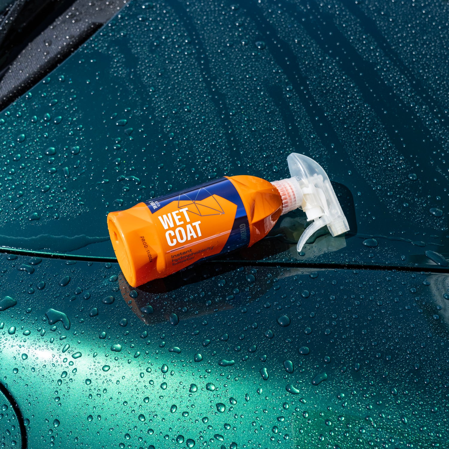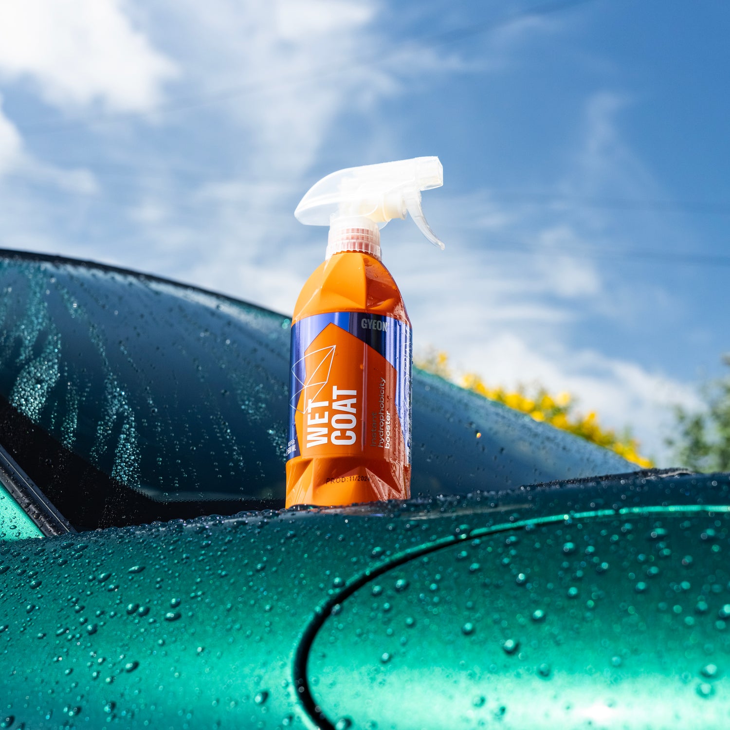 GYEON Q²M WetCoat is an SiO₂-based wet sealant that is sprayed onto wet paint and immediately rinsed off with water. The silicon dioxide particles contained form a thin, hydrophobic protective layer on the surface. Without rubbing in or polishing, instant paint protection with visible gloss and water beading effect is created on paint, rims, glass, and plastic.