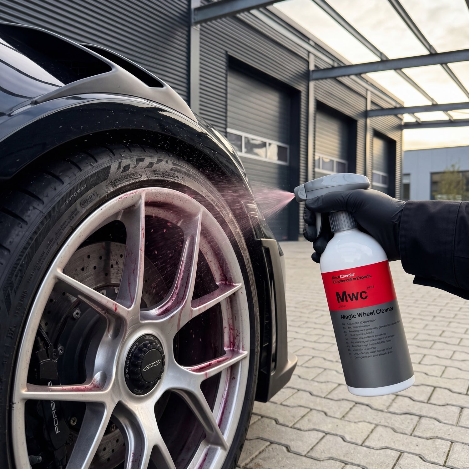 The Magic Wheel Cleaner, internally called "MWC", is an acid-free wheel cleaner from Koch-Chemie's workshop line. The active ingredient, ammonium mercaptoacetate, reacts with iron(III) compounds in brake dust and removes them from the wheel surface as a red-violet complex. The color change is not a dye but a direct chemical reaction. It is material-compatible with polished aluminum, painted aluminum, chrome, and steel at a pH value of 5 to 6.