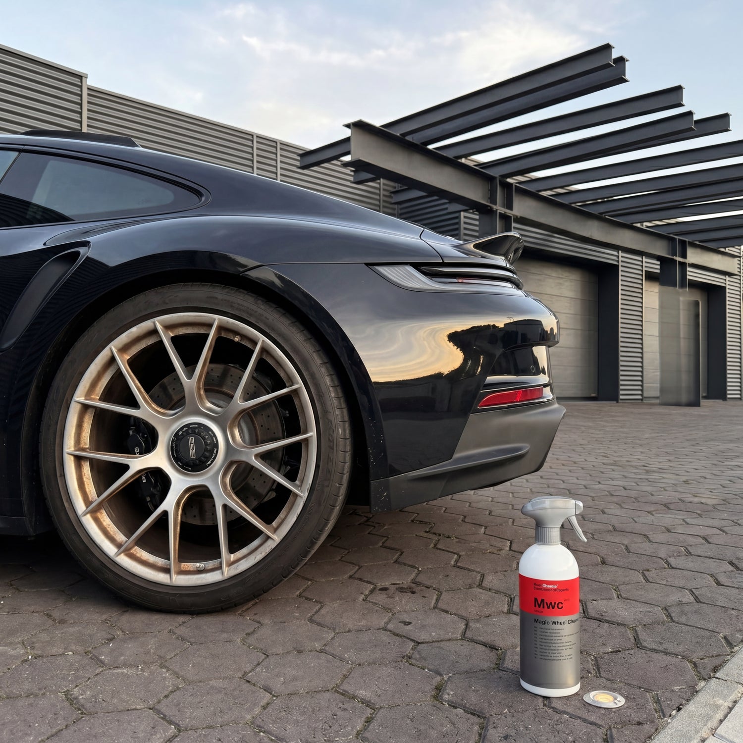 Where MWC is not the right product: Baked-on tar, bitumen stains, and oily contaminants do not react with thioglycolate salts. For these, you need a solvent-based tar remover. For extremely neglected rims with months-old brake dust that has worked its way into the pores, the stronger Koch-Chemie Reactive Wheel Cleaner might be the better choice — its acid system is more powerful, but not suitable for all rim materials. The decision is clear: If safety on chrome and polished rims matters, use MWC. If maximum cleaning power is needed and you're working with painted aluminum and steel, use RWC.