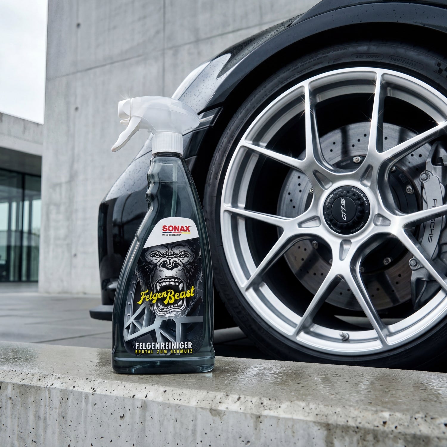 What is the SONAX WheelBeast? An acid-free wheel cleaner with a color-changing indicator that chemically dissolves iron particles on steel, aluminum, and chrome wheels — including TPMS approval. Not suitable for freshly repainted wheels, burnt-in tar, or hot surfaces directly after driving.