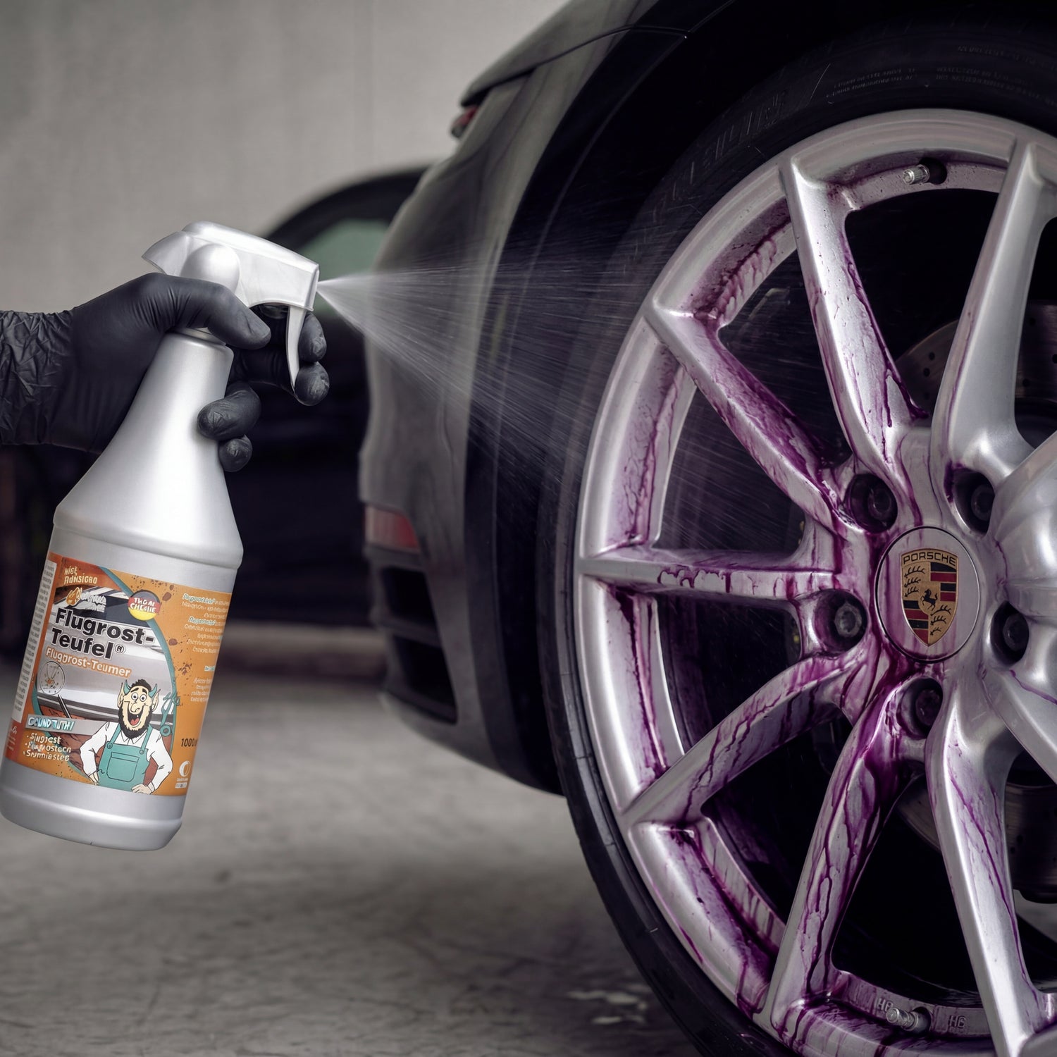 TUGA Chemie Flugrost-Teufel is an acid-free rust remover with a visible color change. It chelates the iron particles that settle as rust-brown spots on paint, clear coat, car glass, aluminum rims, and chrome trim, and rinses them away completely with the next jet of water. The color change to violet shows in seconds where the product is working. Acid-free means safe on sensitive clear coats, painted rims, forged wheels, and polished aluminum rims. Application time is three to five minutes on a cool, shaded surface, then rinse thoroughly from top to bottom. One liter is sufficient for an entire station wagon, including rims, for normal contamination. For annual decontamination before claying, polishing, and sealing. Available as a 1-liter spray bottle for spot application and as a 5-liter canister for detailing.