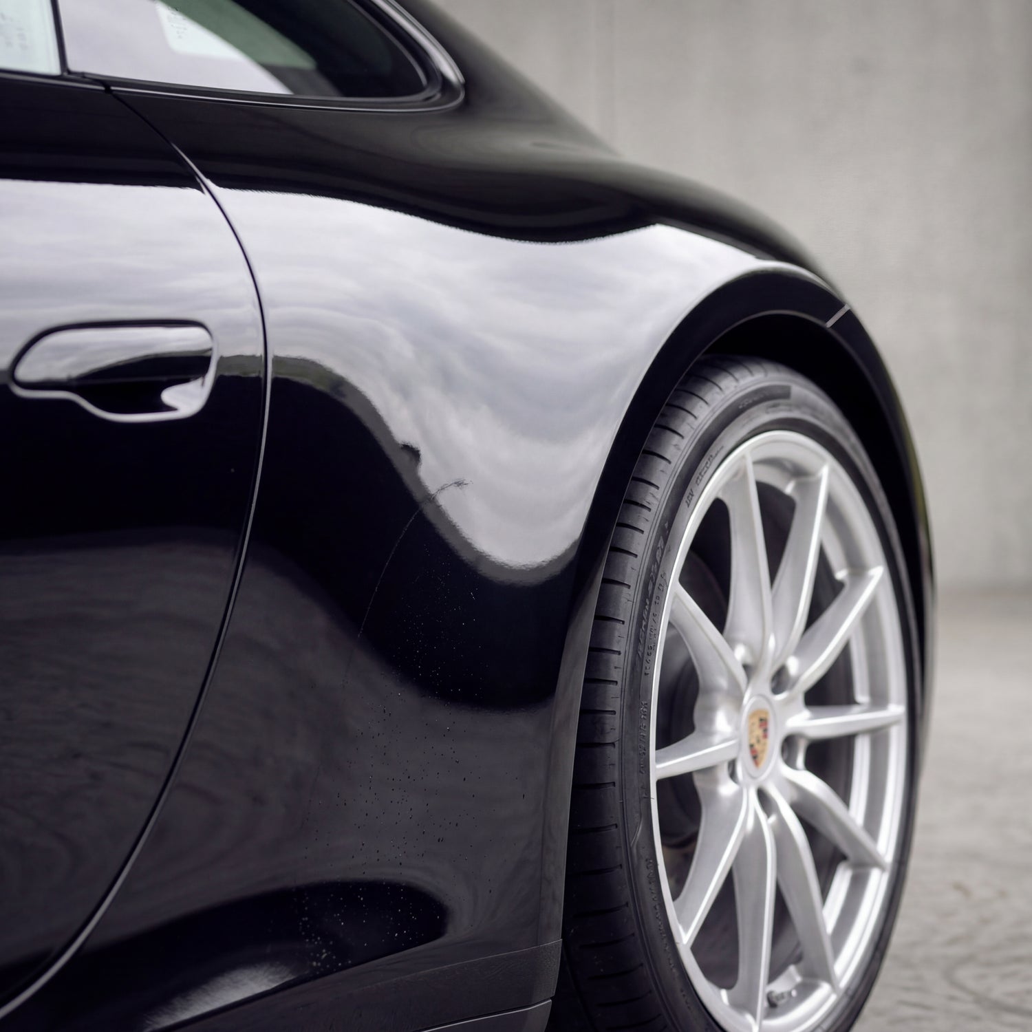 Clean black Porsche 911 rear flank after treatment with streak-free silver rim without rust stains