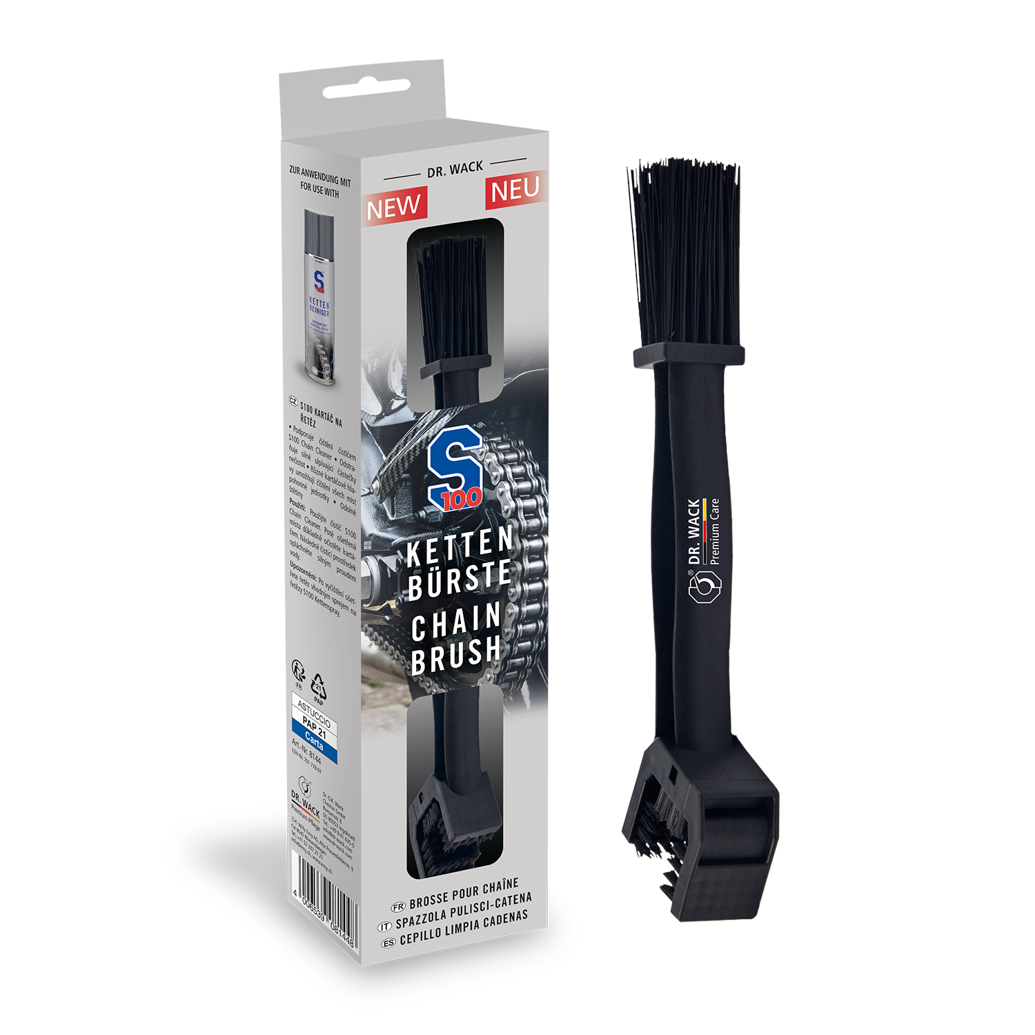 Effektive Reinigungs­bürste für verschmutzte Motorradketten mit der Dr. Wack "S100" Kettenbürste für Motorrad