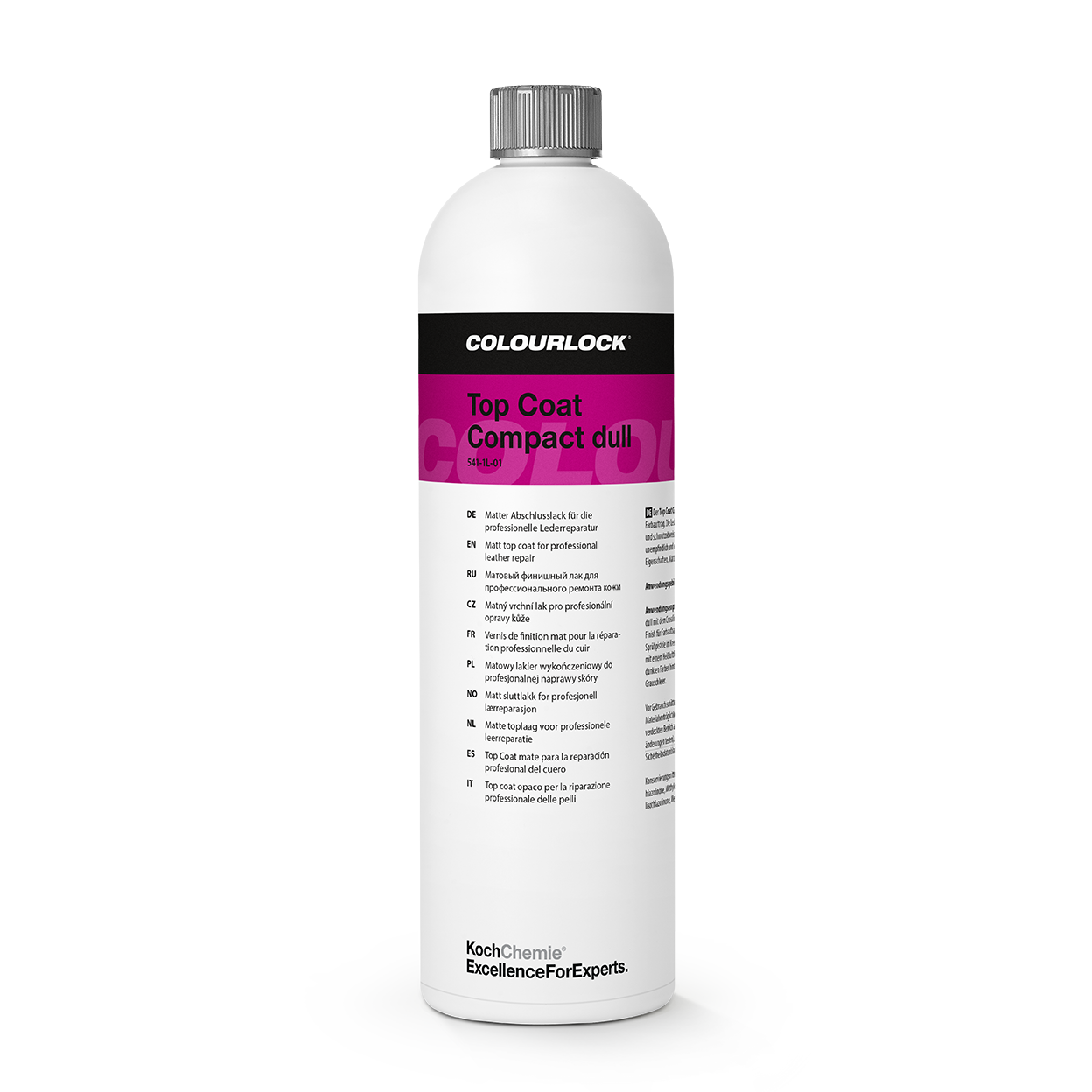 COLOURLOCK Top Coat (Compact / Dull) ist der hochkonzentrierte, matte Abschlusslack für Lederreparaturen, Farbauffrischungen und detaillierte Finish-Arbeiten. Die Compact-Version liefert maximale Schutzleistung in geringem Auftrag und sorgt für ein robustes, authentisch mattes Finish. Perfekt für moderne Fahrzeugleder, hochwertige Möbel und Interieurflächen, bei denen ein natürlicher, matter OEM-Look entscheidend ist. Der Lack stabilisiert den Farbauftrag, schützt vor Abrieb, Schweiß und Alltagsbelastungen und schließt die Reparatur dauerhaft haltbar ab.