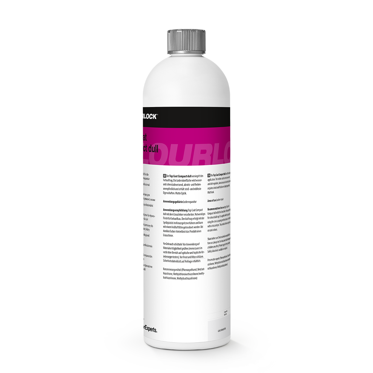 COLOURLOCK Top Coat (Compact / Dull) ist ein hochkonzentrierter, matter Abschlusslack für professionelle Lederreparaturen. Er schützt farbige Reparaturflächen zuverlässig vor Abrieb, Schweiß, Reibung und alltäglicher Beanspruchung und erzeugt ein natürlich-mattes, OEM-getreues Finish. Die kompakte Formulierung bietet maximale Schutzleistung bei geringem Verbrauch und eignet sich besonders gut für moderne Automobilleder, matte Möbeloberflächen und strapazierte Interieurteile. Der Lack wird dünn über die Farbschicht aufgetragen und härtet zu einem widerstandsfähigen, flexiblen Schutzfilm aus, der das Finish stabilisiert und optisch harmonisiert. In Kombination mit Additiven wie Crosslinker CD, Duller oder Soft Slip lässt sich Haltbarkeit, Glanzgrad und Haptik präzise anpassen. Die ideale Wahl für alle, die Reparaturen dauerhaft schützen und ein perfektes, mattes Endfinish erreichen möchten.