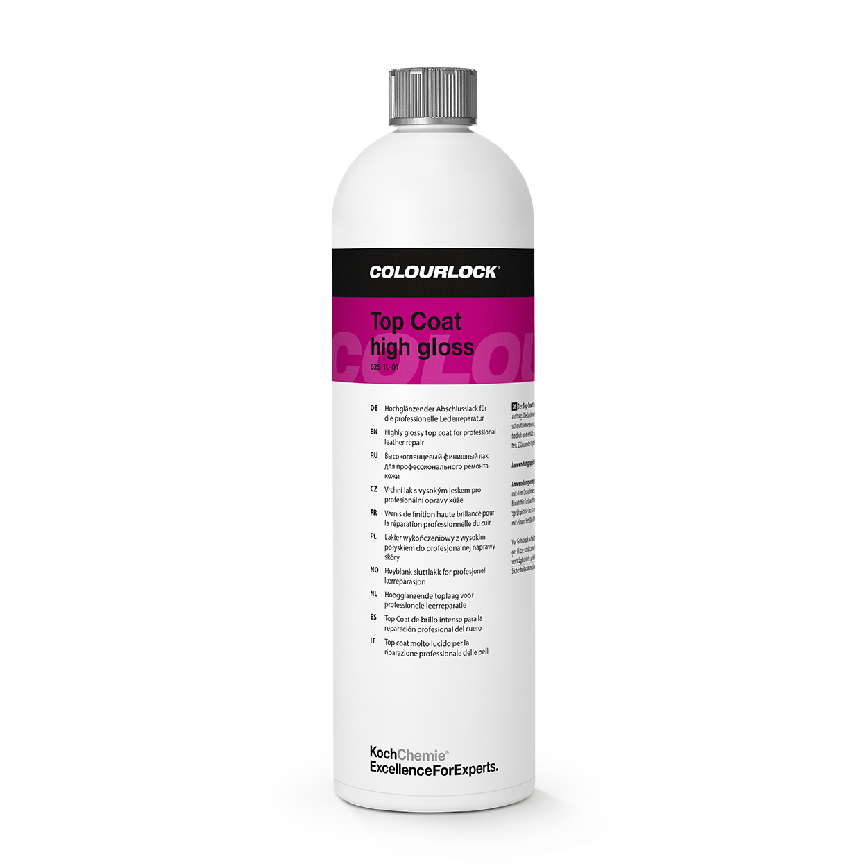 Was macht COLOURLOCK Top Coat High Gloss? — Der hochglänzende Abschlusslack schützt farblich repariertes Leder dauerhaft und erzeugt ein extrem brillantes, spiegelndes Hochglanzfinish für dekorative Möbel-, Fashion- und Interieurleder.
