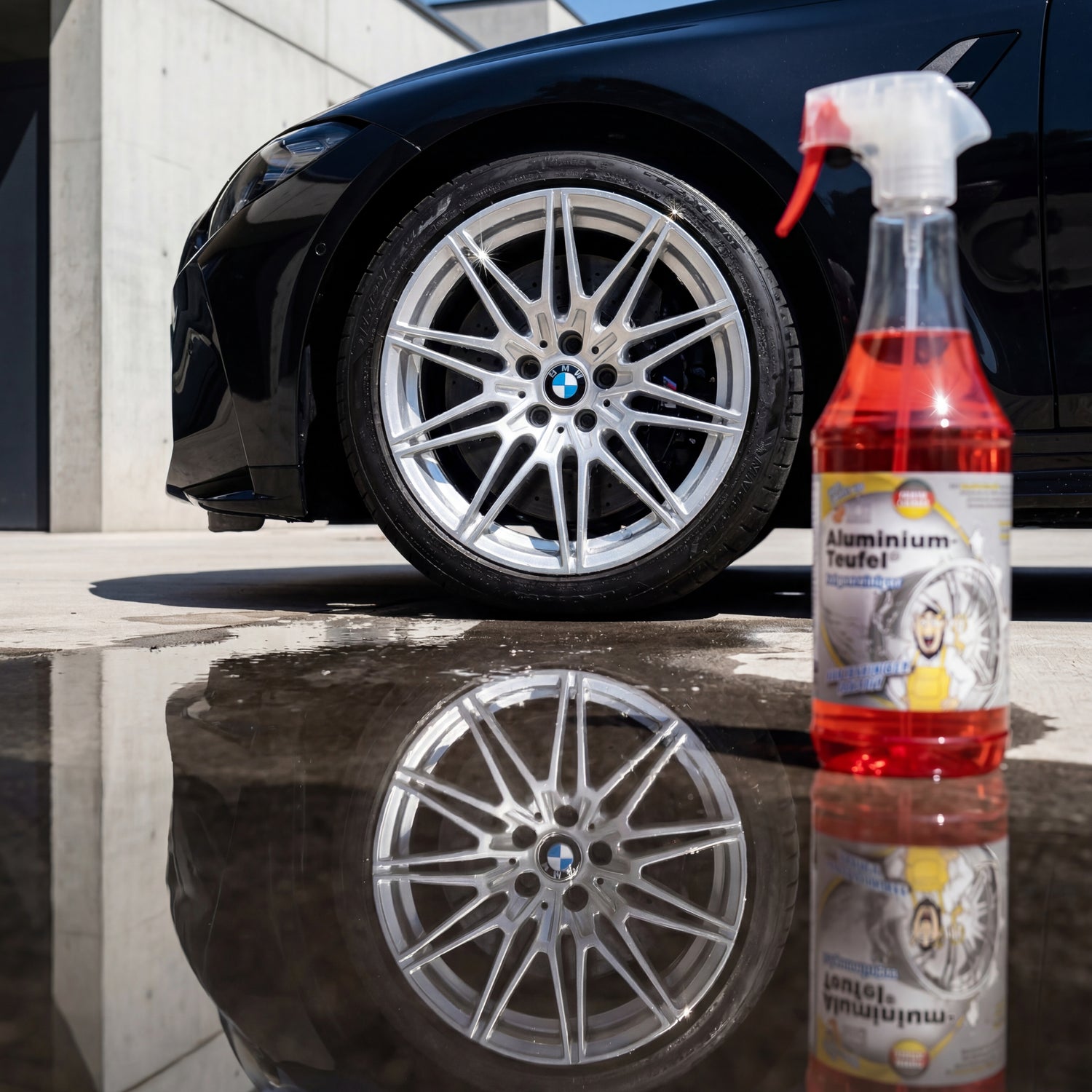 Praxistipp von Detailing1: Der häufigste Fehler beim Aluminium-Teufel Rot ist zu lange Einwirkzeit. Nach 5 bis 7 Minuten ist die maximale Reaktion erreicht — längeres Stehen trocknet das Gel an und verschlimmert Fleckenbildung statt sie zu lösen. Optimal sind 3 bis 5 Minuten bei normaler Last, maximal 7 Minuten bei Extremverschmutzung. Danach kräftig mit viel Wasser spülen, bis das ablaufende Wasser völlig klar ist — Säurerückstände auf dem Klarlack führen unter UV-Strahlung zu matten Schleiern. Arbeite immer auf kalten Felgen: Nach einer Autobahnfahrt mindestens 10 bis 15 Minuten warten, bis die Bremsscheibe abgekühlt ist.