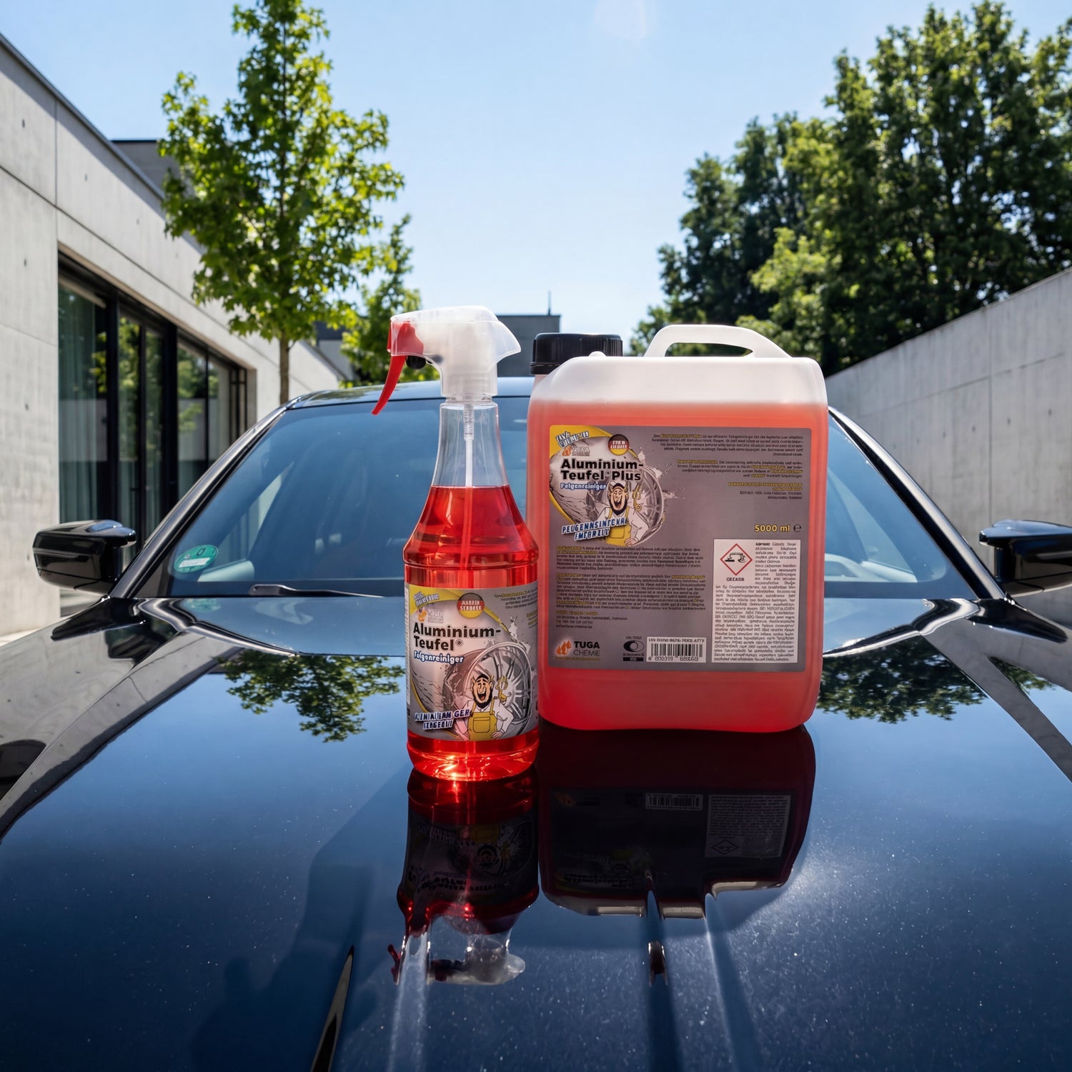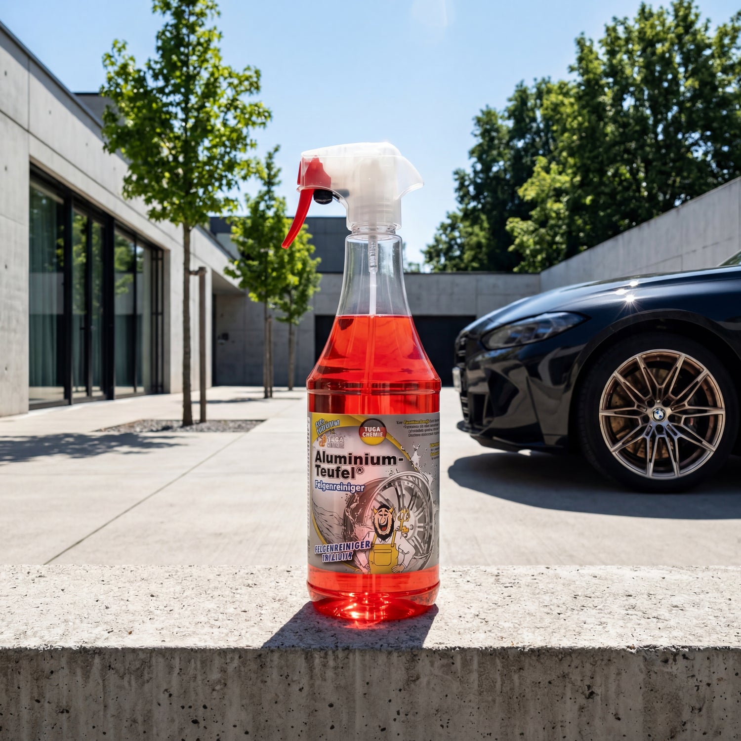 Was ist der Aluminium-Teufel Rot? Ein säurehaltiger Felgenreiniger von TUGA Chemie mit Phosphorsäure und Farbumschlag, der extrem eingebrannten Bremsstaub, Flugrost und mineralische Kalkablagerungen auf lackierten Alu- und Stahlfelgen chemisch löst. Nicht geeignet für polierte, anodisierte, verchromte oder matte Felgen — die dosierte Säure hinterlässt dort irreversible Ätzspuren.